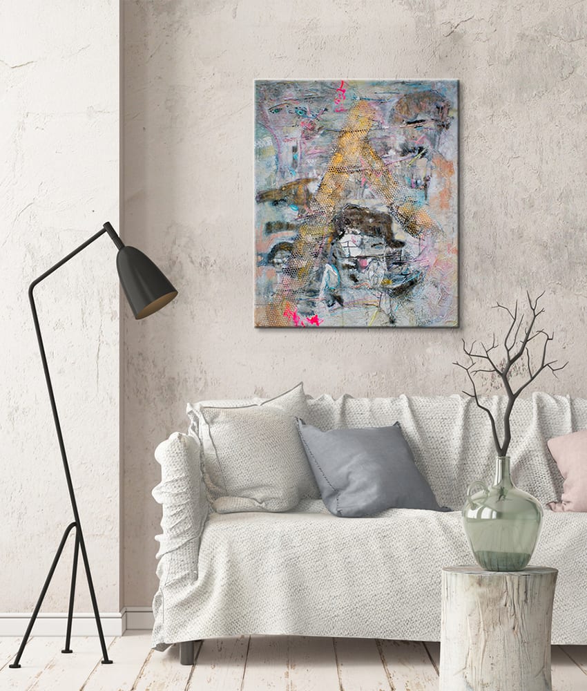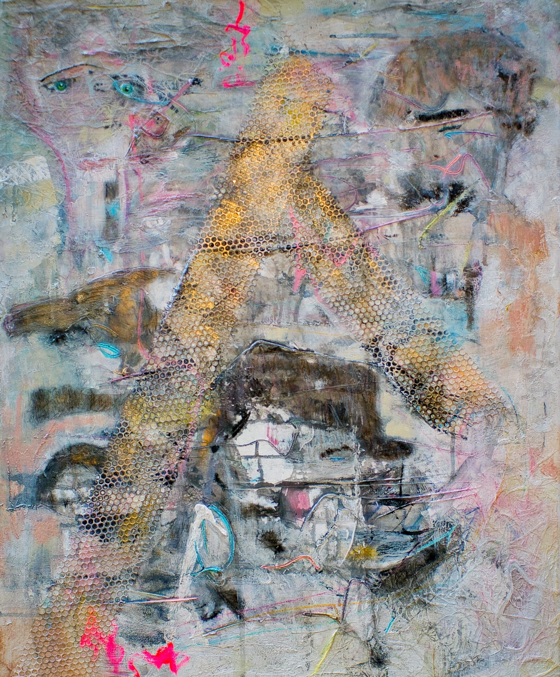 MEDIUM: Mixed Media on Canvas (acrylic, inks, pencils, charcoal, pastels, papers, molding, textiles)