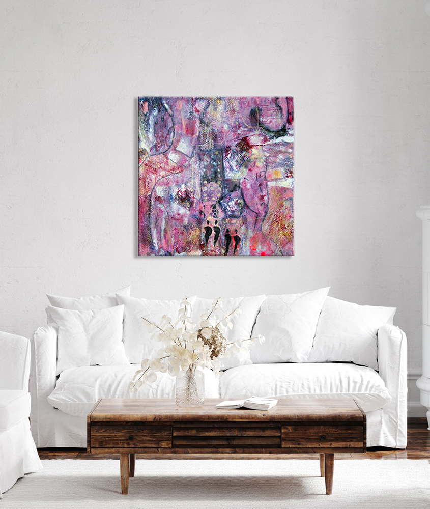 The artist envisions this work as a luminous, abstract meditation on a fairy-tale city alive with movement, energy, and possibility. Imagining a world rendered in layered pinks—blush, rose, and deeper resonant tones—she places her focus on the vitality of a large urban environment filled with beings from many walks of life. Within this imagined landscape, she includes the presence of a whimsical cat-like figure with a tall hat, a playful nod to the kind of character one might encounter in a storybook world. She also imagines a tall city structure rising among the life surrounding it, suggestive of the scale and diversity of a bustling metropolis.