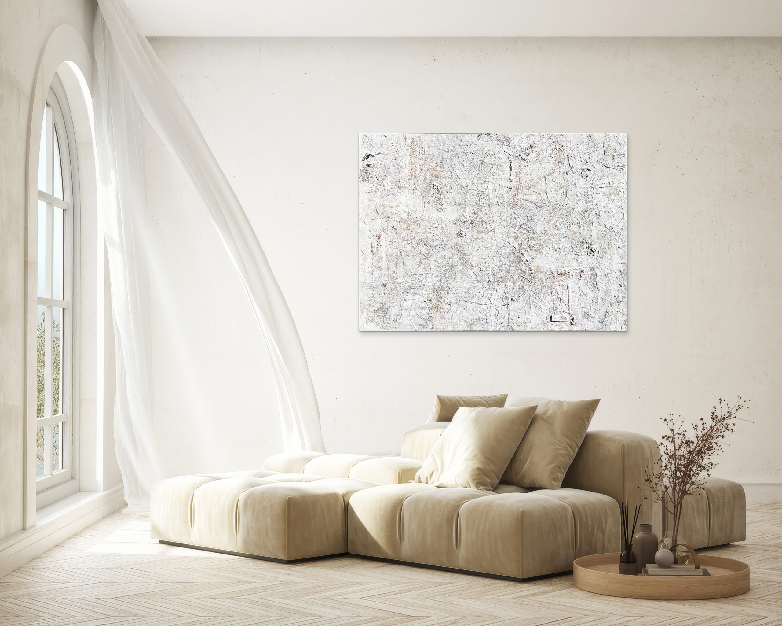 This large abstract is an exploration of texture and form, with the white background serving as the foundation for a quiet display of subtle details. Rich in layers of texture—undulating patterns, smooth curves, and jagged edges—each shape and line whispers depth and complexity. The varying white tones create an ethereal sense of movement, while delicate hints of gold and silver shimmer throughout, evoking quiet luxury and refinement. The contrast between the serenity of the painting and the chaos it alludes to offers a complex and emotional reflection on the fragile nature of both beauty and life.